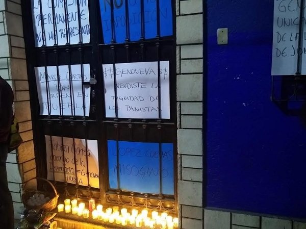 Los panistas quienes encontraron con candado las oficinas aprovecharon para colocar las cartulinas con mensajes que portaban en la puerta y en las ventanas, así como también colocaron una canasta con huevos, ya que señalaron que eso le hizo falta al dirigente municipal del albiazul, así como encendieron una veladora como señal de que la democracia en el PAN a muerto.